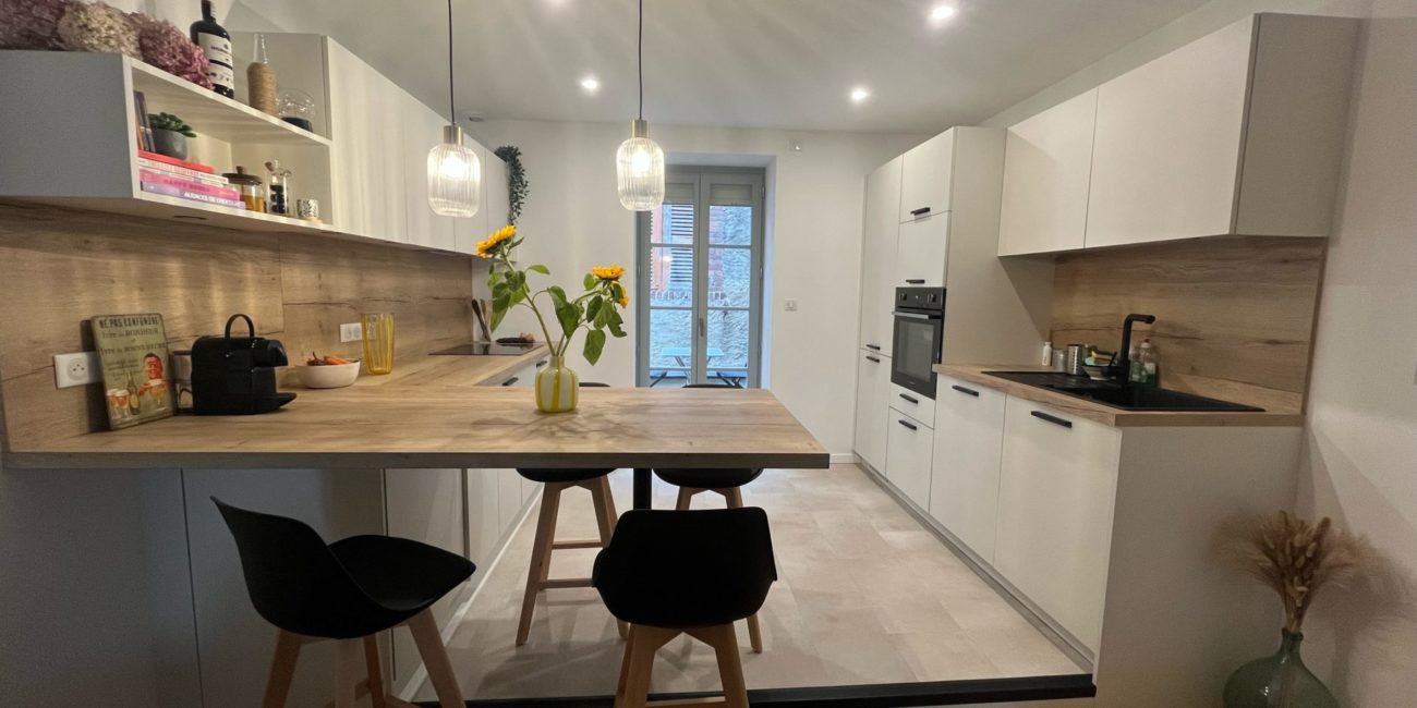 “On adore notre nouvelle cuisine ! Elle est super pratique et hyper jolie, avec des matériaux vraiment top. Le bois et le plan noir se marient super bien, et l’éclairage LED apporte une petite ambiance super sympa. Tout a été bien pensé, on ne pouvait pas rêver mieux !”
