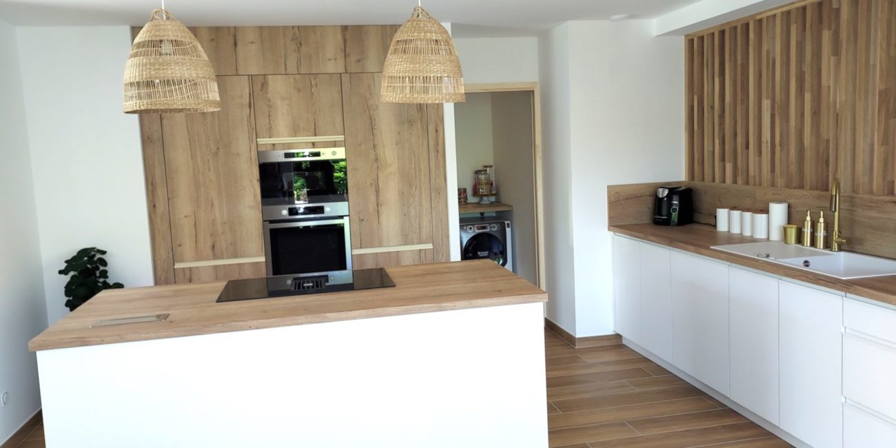 En face des colonnes, la zone de cuisson intègre plaque, hotte murale et coulissants, avec un meuble haut en bois pour encore plus de rangement. Au centre, l’îlot joue son rôle : généreux en rangements, il offre un espace spacieux pour préparer des repas dignes d’un chef et les servir à vos amis en toute convivialité.