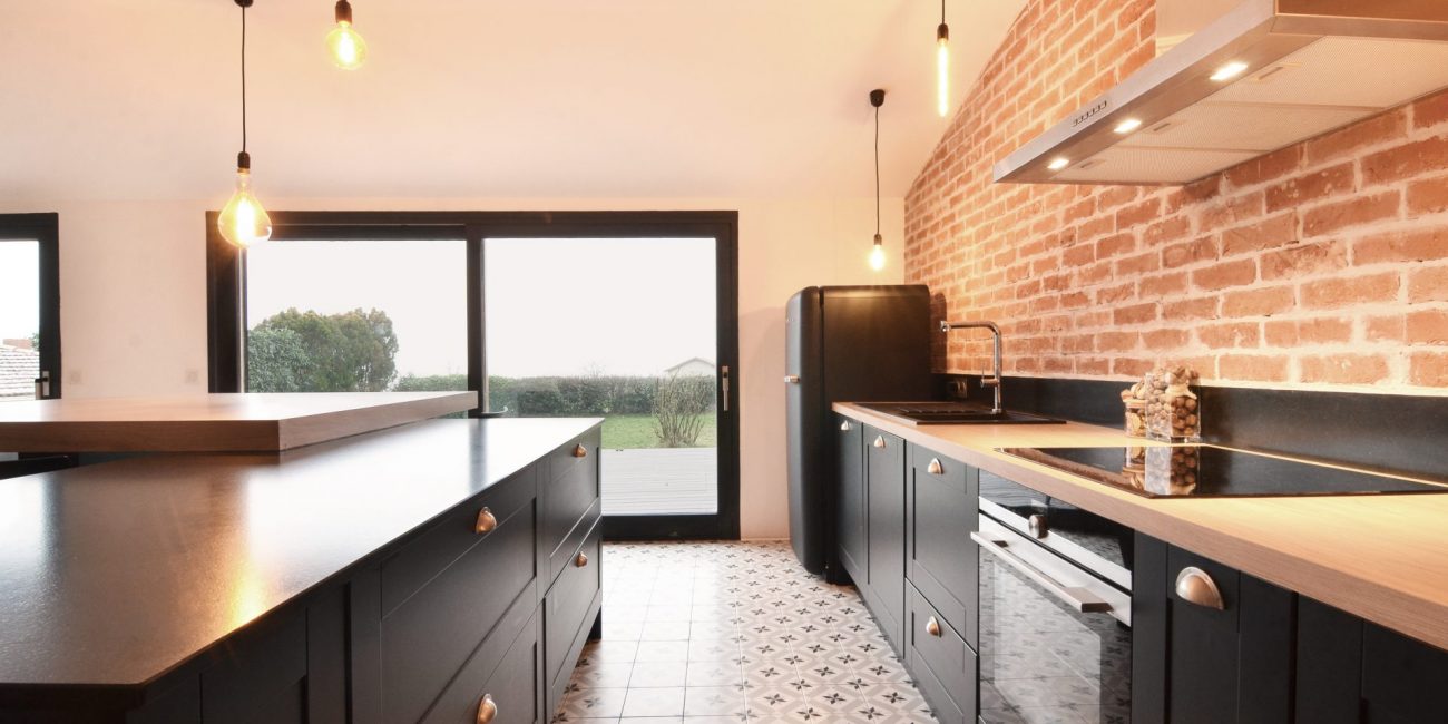 La superficie de la cuisine a été agrandie grâce à l’ouverture du cellier se trouvant au fond de la pièce, et l’espace a été aménagé de manière à rester fonctionnel. Un grand meuble de rangement et des étagères personnalisées viennent décorer et habiller la pièce, tout en optimisant le volume.