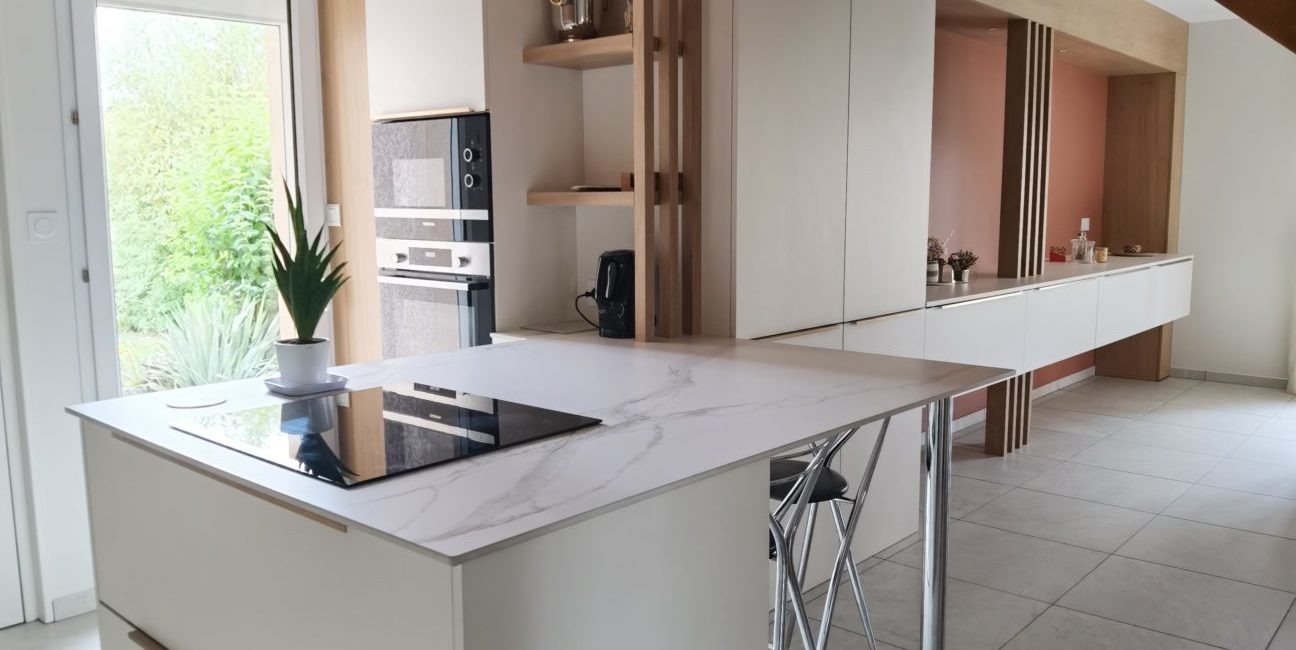Tom et Lucie vous invitent à découvrir leur cuisine, un espace où le blanc et le bois s’entrelacent pour une ambiance douce et contemporaine, offrant une transition harmonieuse vers le salon.