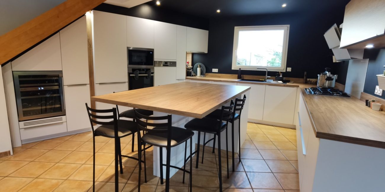 Dans cette cuisine, le blanc et le bois se combinent pour créer une ambiance douce et lumineuse. Les teintes naturelles et les accents noirs apportent une touche moderne. L’îlot central favorise la convivialité, et les couleurs apaisantes rendent l’espace chaleureux, idéal pour partager des moments agréables.