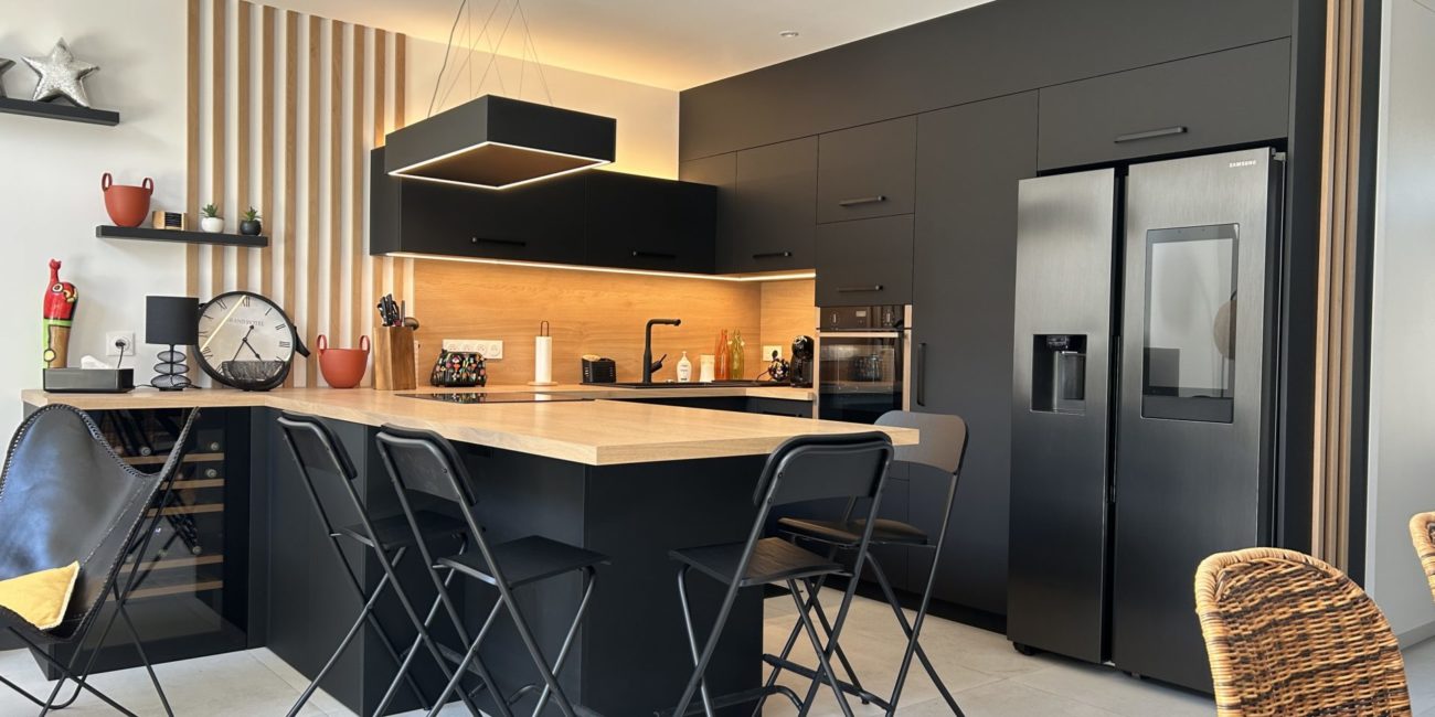 🔸 Cuisine : Place à une cave à vin encastrée, des étagères pour les épices, des placards pour plus de rangements et un panneau déco avec un éclairage chaleureux pour suspendre vos plus jolis verres.